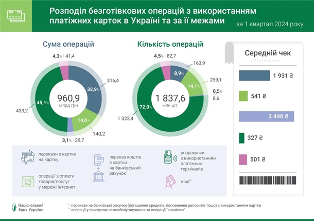 Сумма операций (безналичных и из получения наличных) с использованием платежных карт в Украине и за ее пределами в первом квартале 2024 года составила 1 трлн 489,7 млрд грн. Из них безналичными на сумму 960,9 млрд грн. Доля безналичных сделок находилась на уровне 64,5%.