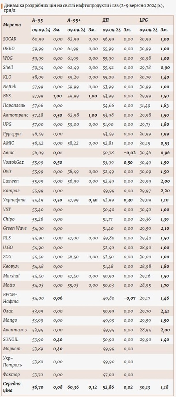 Разница между премиум- и дискаунт-сетями оставалась постоянной: бензин: 6,35 грн/л; дизель: 6,45 грн/л; для газа: разница уменьшилась на 73 коп./л - до 1,93 грн/л.