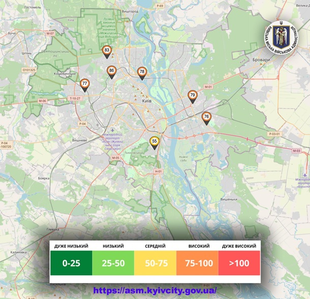 - проспект Берестейский, 97 - индекс качества 77 (высокий уровень загрязненности).