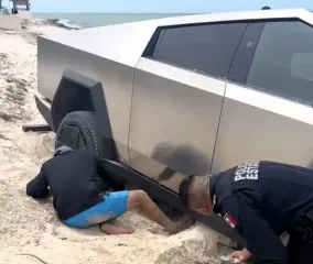 На одном из мексиканских пляжей произошла курьезная история: водитель ехал вдоль пляжа на своем Tesla Cybertruck, но застрял в песках. Тогда он на помощь вызвал копов, чтобы те откопали машину из-за грядущего прилива.
