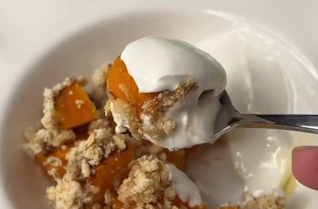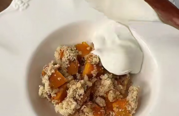 Подавайте крамбл тёплым, с ложкой холодного йогурта или шариком ванильного мороженого — контраст температур делает десерт особенно уютным. Простота, аромат и вкус осени в каждой ложке.