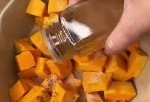 Подготовьте основу. Нарежьте тыкву аккуратными кубиками, перемешайте с мёдом (или сахаром) и корицей. Разложите на дно формы.