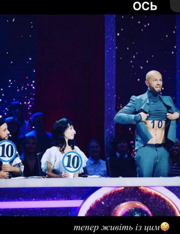 На фото хореограф позирует рядом с коллегами Екатериной Кухар и Дмитрием Монатиком именно в момент, когда те поднимают свои «десятки». Влад решил быть «оригинальным» и нарисовал оценку прямо на своем теле.