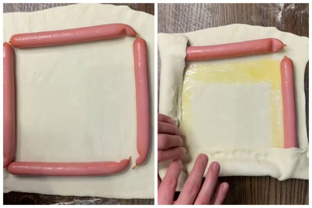 - Раскатайте тесто и выложите по краям сосиски — так, будто строите бортики для сырного озера. Закройте сосиски тестом.