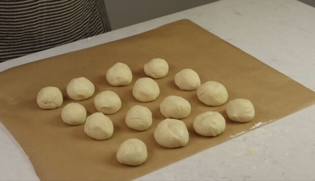 Разделите тесто на четыре равные части. Прежде чем работать с каждой частью, посыпьте столешницу щепоткой муки и сформуйте из теста небольшой ровный цилиндр. Снова разделите сформованное тесто на четыре части размером с грецкий орех. Быстро сформуйте из каждой части шар руками и положите его на чистый противень, застеленный пергаментом. Повторите с остальными частями.