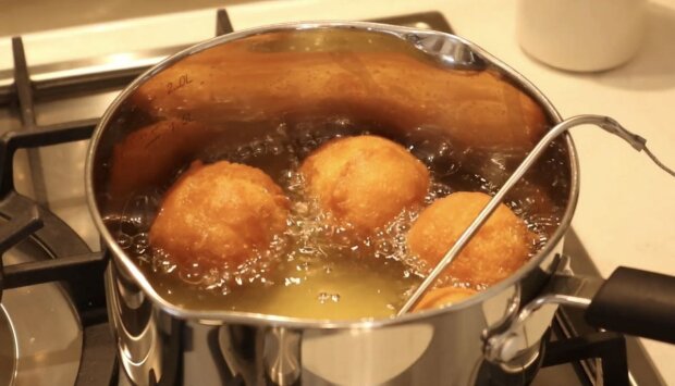 Разогрейте масло для жарки пончиков до 170 °C. Выложите несколько пончиков на смазанную маслом сковороду и жарьте по 3 минуты с каждой стороны до золотисто-коричневого цвета. Извлеките готовые пончики из масла и выложите их на тарелку, застеленную бумажными полотенцами, чтобы стекло масло.