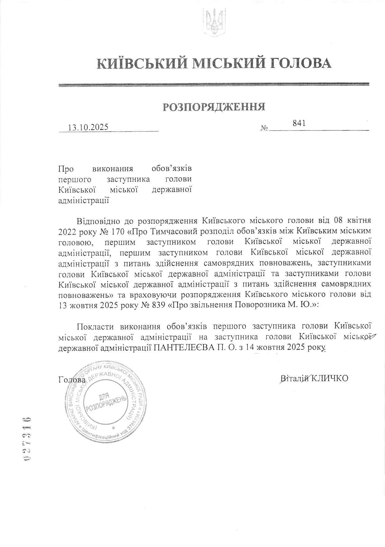 Другим распоряжением исполнение обязанностей первого заместителя главы КГГА возложено на Петра Пантелеева.