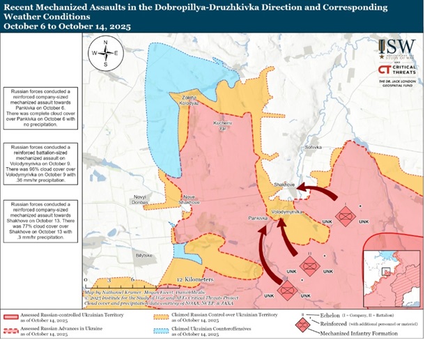 Как сообщает американский Институт изучения войны, 6 октября российские войска осуществили усиленный механизированный штурм, задействовав как минимум роту солдат возле Паньковки (на восток от Доброполья), во время которого Силы обороны повредили и уничтожили четыре танка и восемь единиц бронетехники.