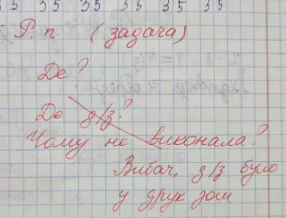 Мама украинской школьницы Валерия, которая в соцсети Threads имеет никнейм lerochka_kr, обнародовала фото тетради своей дочери, на странице которой учительница сделала надпись с извинением. Педагогиня сначала сделала замечание ребенку из-за отсутствия домашнего задания, но впоследствии признала, что ошиблась, поскольку задача должна была быть выполнена в печатной тетради.