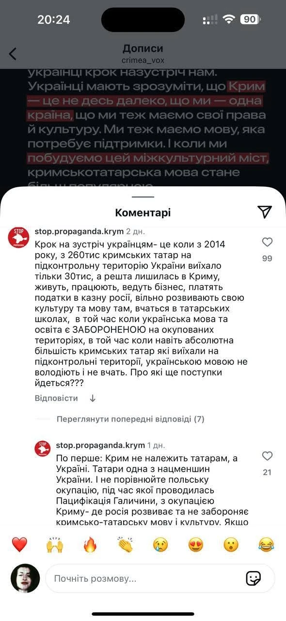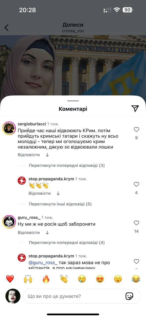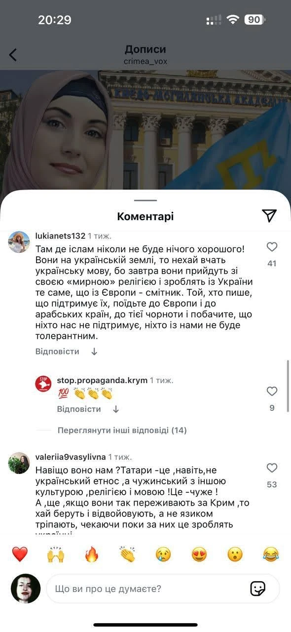 Массовое появление оскорбительных сообщений мы заметили, в частности, под публикациями Сrimea Vox, Суспільне Крим и Qirim media. Вот, к примеру, фрагменты из комментариев под публикацией в Instagram Сrimea Vox о начале преподавания крымскотатарского языка в Киево-Могилянской академии: "Татаро-монголы официально заняли Киев!", "Как только хоть малюсенькая часть этой заразы под названием ислам попадет в Украину, искоренить это будет крайне трудно", "Татары - это даже не украинский этнос, а чужой, с другой культурой, религией и языком", "Могилянка поплыла. Разберитесь, когда татары появились в Крыму, а когда там жили русины-украинцы".