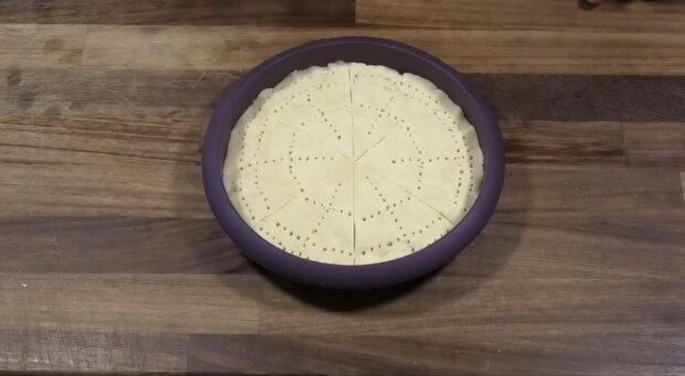 Выложите форму замешанным тестом. Перед выпеканием разрежьте ножом на отдельные кусочки и сделайте узоры вилкой.