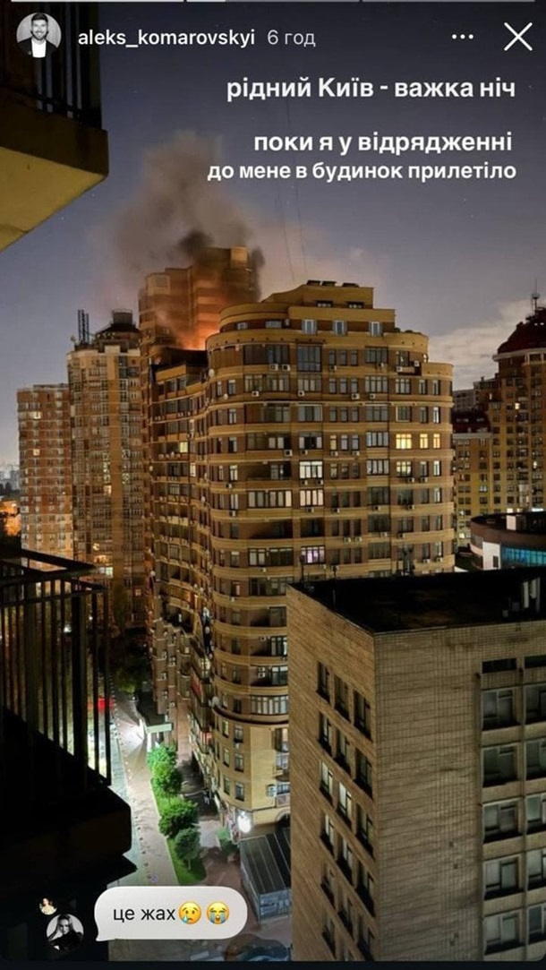 "Родной Киев. Тяжелая ночь. Пока я в командировке, в мой дом прилетело. Соседи шокированы. Слава Богу, все живы" - написал Комаровский.
