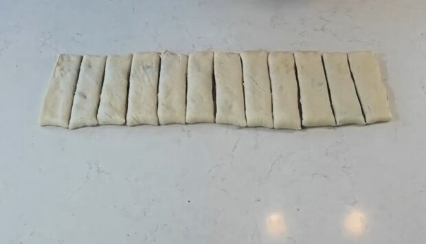 Разделите подготовленное тесто на 12 ровных полосок. Острым ножом разрежьте каждую полоску дважды почти по всей длине, оставляя примерно 1,5 см с одной стороны. Это будет шов.