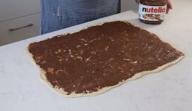 Как только вы добьетесь желаемой формы, намажьте тесто тонким слоем "Нутеллы" или другой сладкой, жирной пасты. Затем посыпьте тесто молотым фундуком.