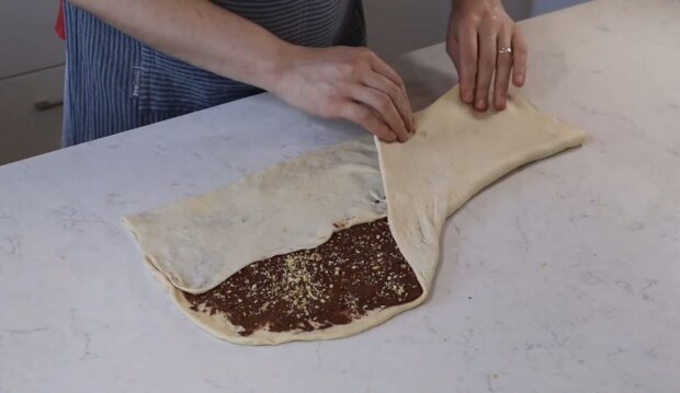 Сложите тесто дважды: сначала медленно сложите примерно 1/3 теста в центр, осторожно растягивая его при необходимости. Разровняйте края теста и сложите остальное тесто таким же образом, чтобы "Нутелла" была видна. Наконец, осторожно зашейте швы.