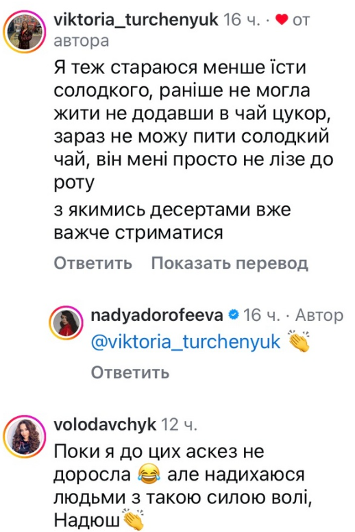 "Я тоже стараюсь меньше есть сладкого, раньше не могла жить, не добавив в чай сахар, сейчас не могу пить сладкий чай, он мне просто не лезет в рот. С какими-то десертами уже труднее сдержаться", - пишут в комментариях.