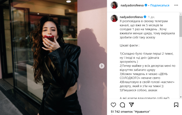 "Я уже как 5 месяцев ем сладкое 1 раз в неделю. Хочу употреблять меньше сахара, поэтому решила сделать себе такую аскезу", — пишет Надя Дорофеева.