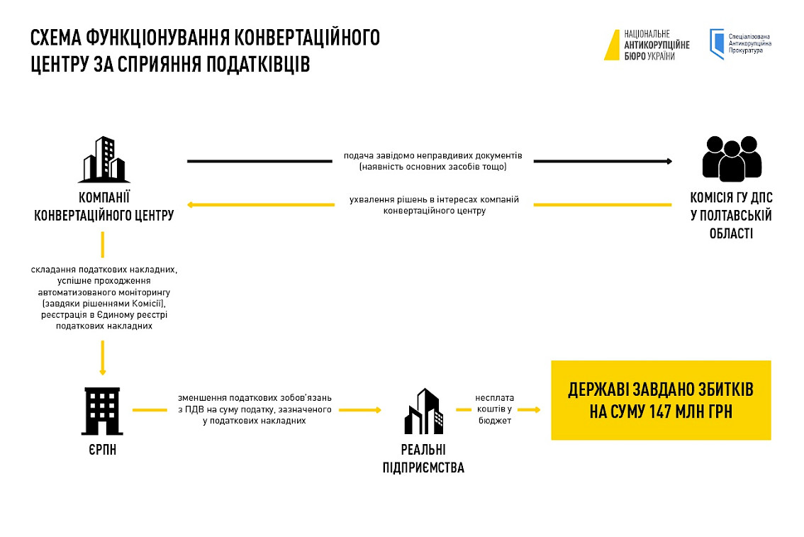 Следствие установило, что тогдашний и.о. председателя Государственной налоговой службы Украины способствовал беспрепятственной деятельности конвертационного центра, а заместитель начальника Главного управления ГНС в Полтавской области, которая возглавляла комиссию по вопросам приостановления регистрации налоговых накладных, обеспечивала принятие решений в пользу компаний конвертационного центра.