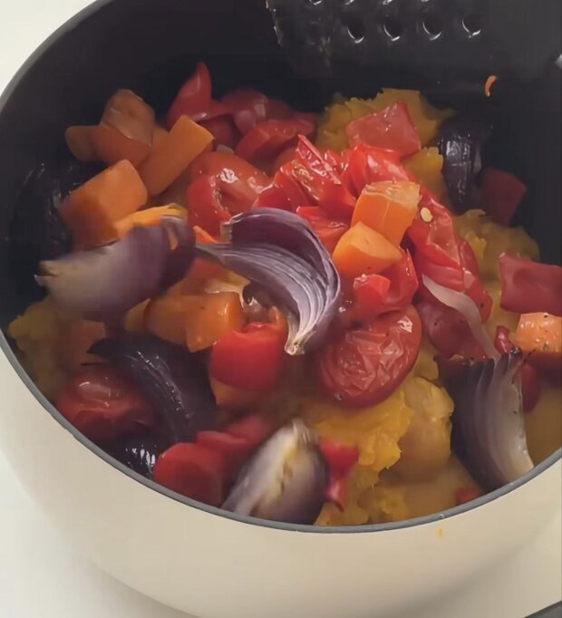 Запеченные овощи помещаем в кастрюлю, добавляем бульон или воду, соль, специи и превращаем в пюре с помощью блендера.
