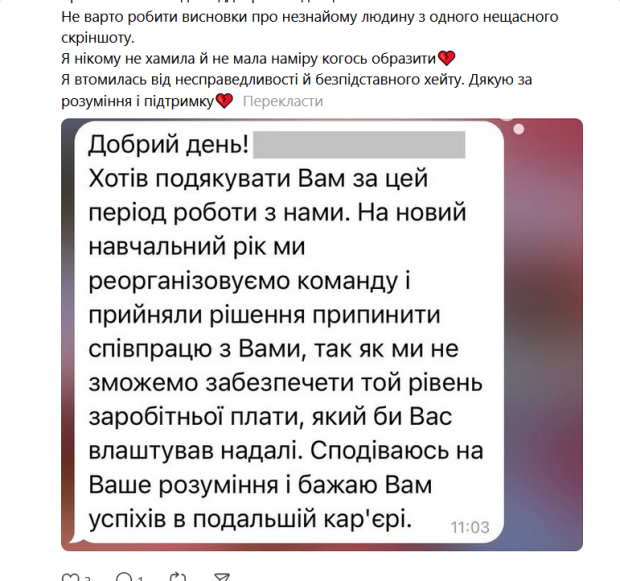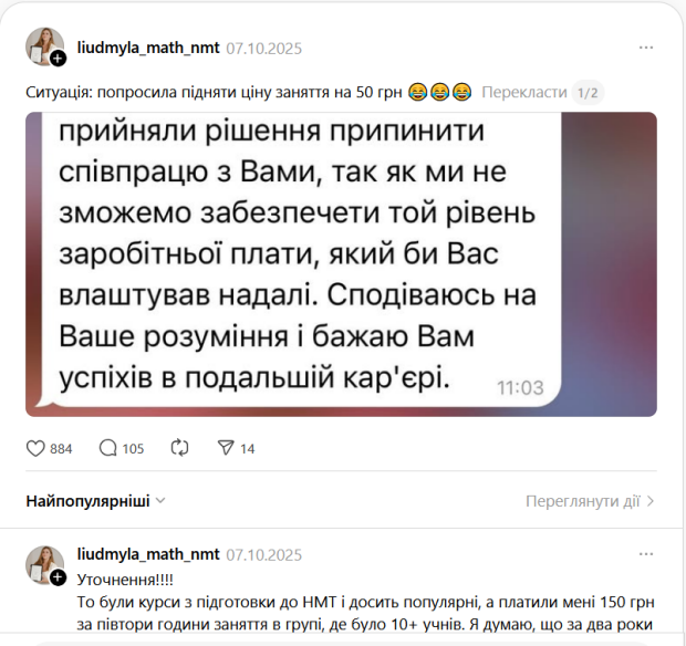 "Уточнение!!!! Это были курсы по подготовке к НМТ и довольно популярные, а платили мне 150 грн за полтора часа занятия в группе, где было 10+ учеников. Я думаю, что за два года сотрудничества, они могли бы позволить себе увеличить мне оплату на 50 грн, для них это не является чем-то непосильным. Просто ищут «мамонта», который готов работать за эти копейки".