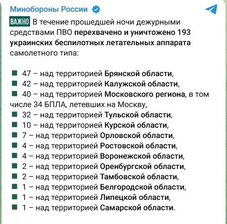 Минобороны России заявило будто российская ПВО в течение ночи перехватила и уничтожила 193 "украинских беспилотника", 34 из которых "летели на Москву". Об этом российское ведомство на своем Telegram-канале.