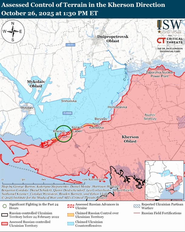 Российские войска ныне продолжают ограниченные наземные атаки на Херсонском направлении, но не продвинулись вперед. В частности, 25 и 26 октября российские захватчики атаковали к востоку от Херсона возле Антоновского моста. Об этом сообщает американский Институт изучения войны (ISW) в своем свежем отчете.