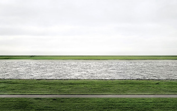 На фото изображена река Рейн между дамбами в пасмурную погоду. В первоначальном варианте можно было увидеть электростанцию, прохожую и собаку, но автор намеренно убрал все эти детали, чтобы достичь полной гармонии линий и цветов. Благодаря ретуши в Photoshop он создал совершенно спокойный, почти абстрактный пейзаж.