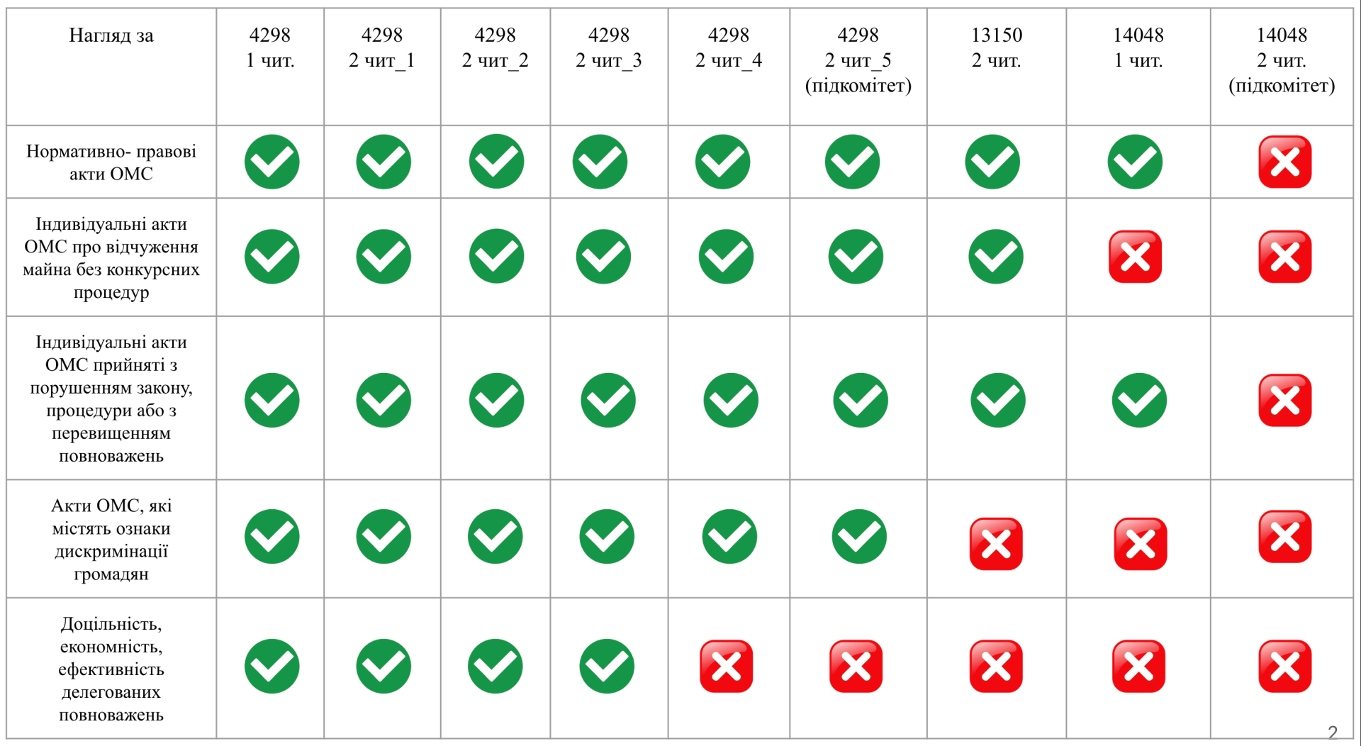 В течение 2020–2021 годов законопроект №4298 имел несколько редакций. Предмет надзора в этих версиях, несмотря на постоянные баталии, был достаточно стабильным. Он охватывал ключевые аспекты, в частности кадровые решения, бюджетные акты, а главное — решения, касающиеся земли и коммунального имущества, которые ожидаемо представляли более высокий интерес, поскольку они несут наибольшие коррупционные риски.
