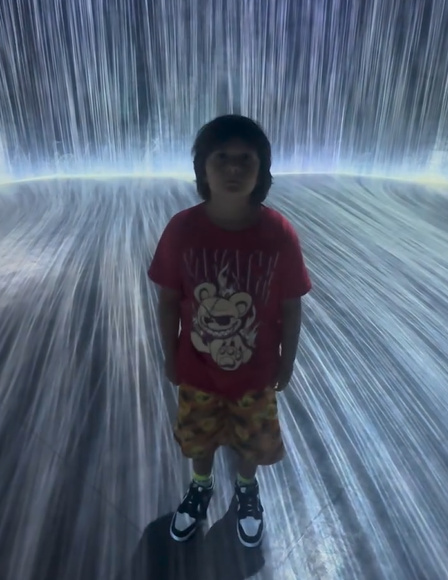 В видео сын Ирины с интересом наблюдал за напоминающими водопад проекциями на стене. После короткого мгновения восторга мальчик побежал к матери с объятиями, создавая атмосферу настоящей семейной теплоты.