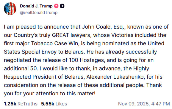 Детали : 9 ноября Трамп заявил, что Коул, "известный как один из самых выдающихся юристов" США, номинирован на должность специального посланника США в Беларуси.