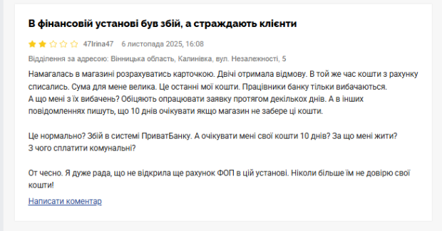 "Работники банка только извиняются. А что мне из их извинений? Обещают обработать заявку в течение нескольких дней. А в других сообщениях пишут, что 10 дней ждать если магазин не заберет эти средства. Это нормально? Сбой в системе ПриватБанка. А ждать мне свои средства 10 дней? За что мне жить?", - возмутилась украинка.
