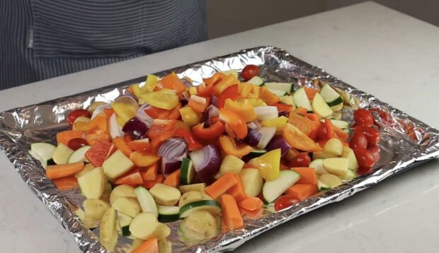 Помойте, очистите и нарежьте овощи на небольшие кусочки. Переложите их на противень, застеленный алюминиевой фольгой, и равномерно распределите по поверхности.