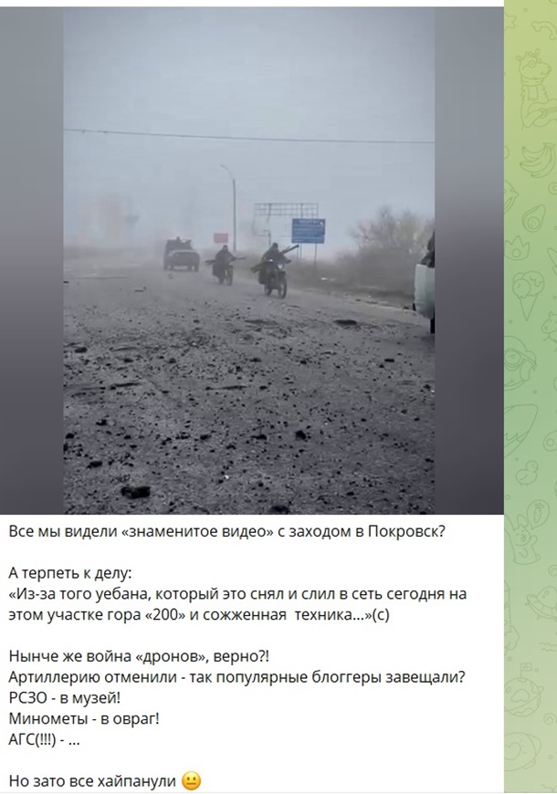 Ряд российских блогеров начали возмущаться, что благодаря публикации видео захода их колонны в Покровск, эта попытка была нейтрализована, а оккупанты разбиты.