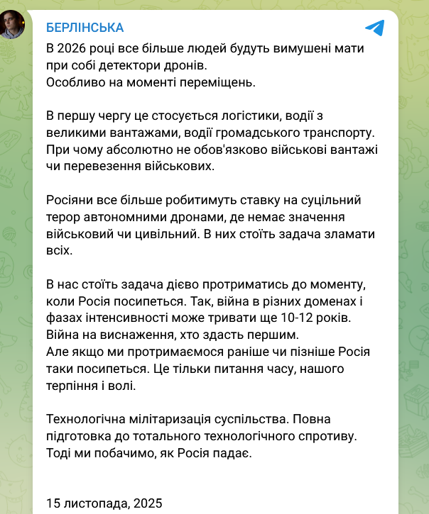 Украинская общественная деятельница и волонтер Мария Берлинская посоветовала украинцам не надеяться на скорое завершение войны. По ее словам, в 2026 году все больше людей будут вынуждены носить с собой детекторы дронов, особенно в моменты перемещения.