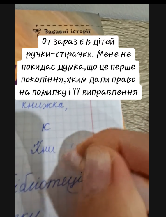 Ручки "пиши-стирай" позволяют легко исправить ошибки, поэтому их очень любят дети и родители. Украинка Ксения в видео в соцсети ТикТок показала , как хорошо вытирает чернила резинка на оборотной стороне ручки, и написала, что, пожалуй, это первое поколение, которому дали право на ошибку.