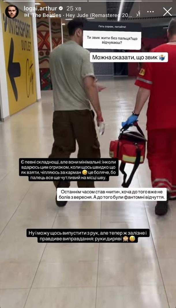 По словам артиста, иногда он случайно ударяется чувствительной фалангой или цепляется за одежду, и это причиняет боль - шов ещё не полностью зажил. Кроме того, Логай отметил, что в последнее время вернулись ноющие ощущения и фантомная боль, которая некоторое время его не беспокоила.