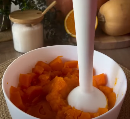 Запеченную тыкву сбивают блендером до однородности, превращая ее в пюре.