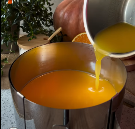 Апельсиновый сок нагревают с сахаром до кипения, дают немного остыть, затем добавляют подготовленный желатин, перемешивая до полного растворения.