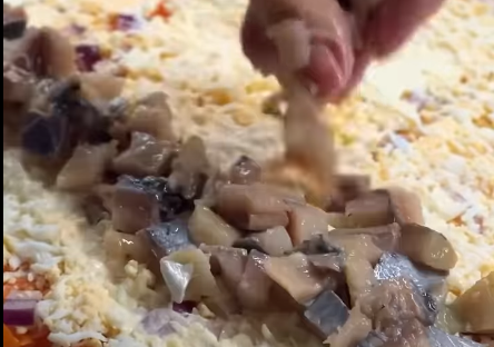Далее выкладываем натертую морковь и еще немного майонеза.