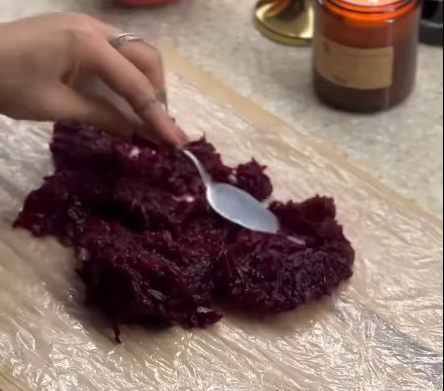Выложите на дощечку пищевую пленку в два слоя, чтобы рулет было удобно сворачивать. Распределите равномерно слой натертой свеклы, полейте майонезом.