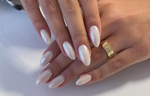 Жемчужные оттенки с мягкими переливами — идеальный спутник Раков в декабре. Добавьте у основания тонкую серебристую «луну». Такой дизайн усиливает интуицию и помогает принимать правильные финансовые решения.