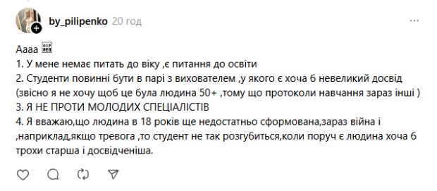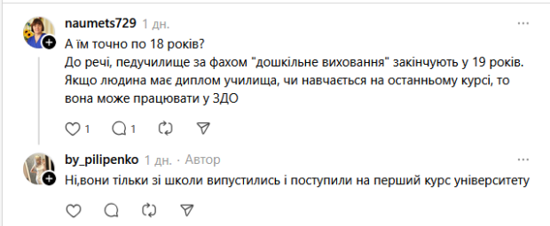 Впоследствии автор сообщения добавила, что ее смущает не возраст воспитателей, а именно отсутствие образования. Она отметила, что студенты должны работать вместе с опытным воспитателем. Тем более что сейчас война, и не факт, что студент не растеряется, если случится что-то чрезвычайное.