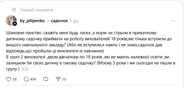 Могут ли в детсадах работать люди без должного образования? Этим вопросом задалась Ирина Пилипенко, поделившись в сообщении в соцсети Treads ситуацией, которая сложилась в детском саду, в который ходит ее ребенок.