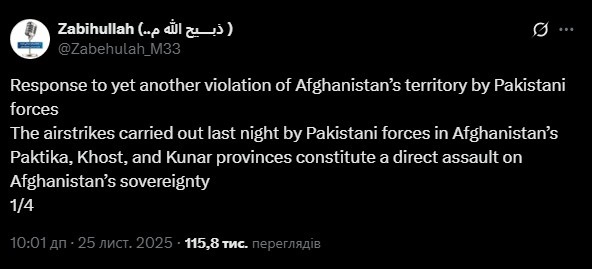 ВВС Пакистана нанесли удары по территории Афганистана, а именно по трём восточным провинциям, что привело к гибели десяти мирных жителей. Об этом сообщил пресс-секретарь движения Талибан Забилла Муджахид на платформе X.