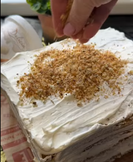 Отделка. В чаше блендера измельчите обрезки лепешки вместе с грецкими орехами до состояния крошки. Посыпьте крошками бока и верх торта.