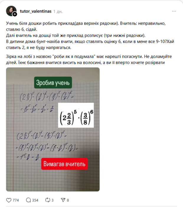 "Ученик у доски делает пример (две верхние строчки). Учитель: неправильно, ставлю 6, садись. Далее учитель на доске тот же пример расписывает (три нижних строчки). У ребенка дома бунт — зачем учиться, если ставят оценку 6, когда у меня все 9-10? Пусть ставит 2, я не буду напрягаться. Звезда на лбу с названием «делай, как я подумала» должна наконец погаснуть. Не ломайте детей. Их желание учиться висит на волоске, а вы его упорно хотите разорвать".