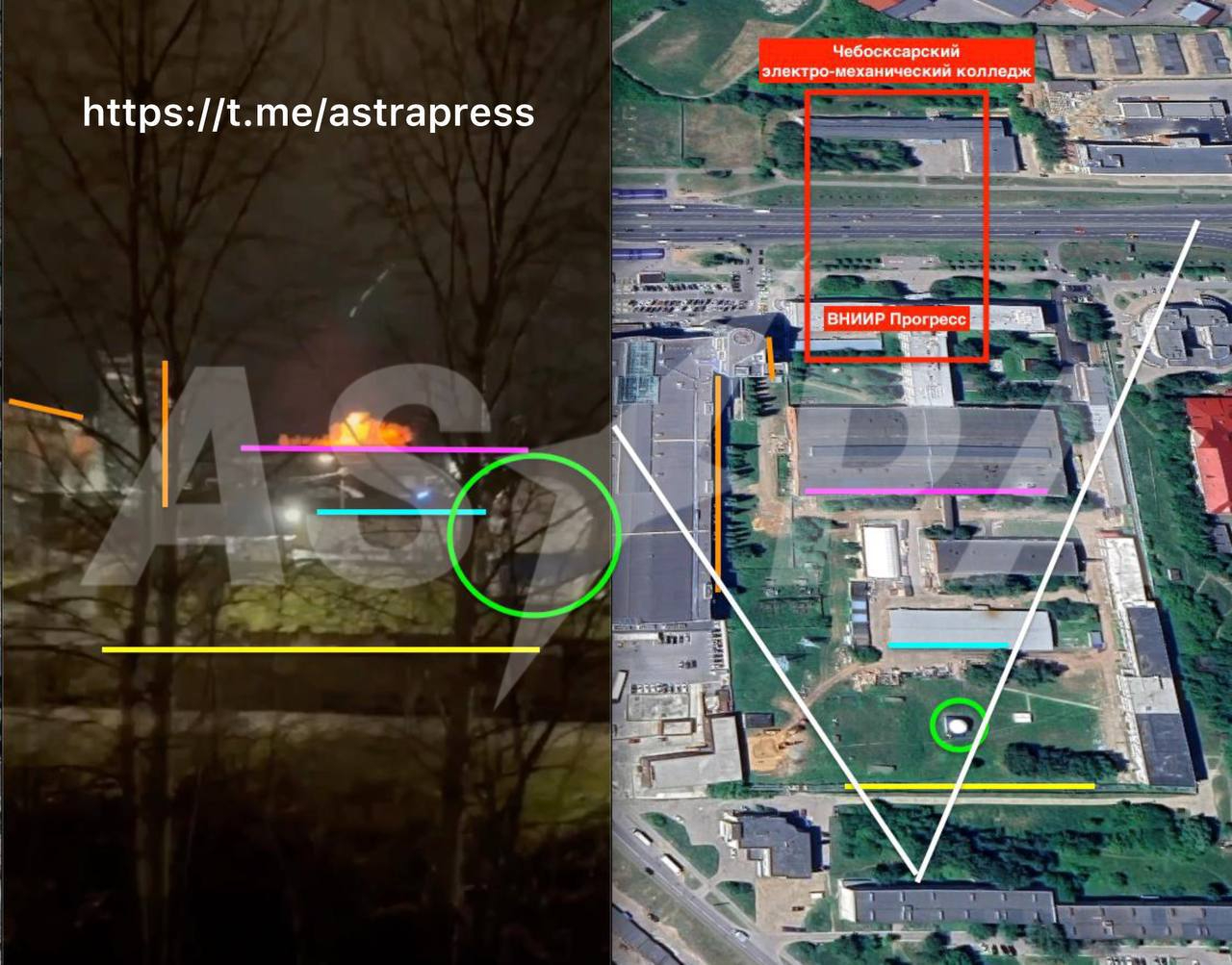 Детали : Однако Astra, которая проанализировала фото и видео из Чебоксаров, сообщает, что дроны попали в предприятие АО "ВНИИР-Прогресс" ул. Яковлева, 4, также пострадал 12-этажный жилой дом по пр. Мира, 37.