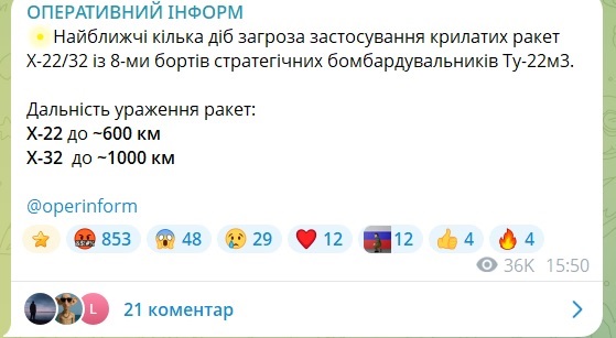 " Ближайшие несколько суток угроза применения крылатых ракет Х-22/32 с 8 бортов стратегических бомбардировщиков Ту-22м3 ", – говорится в сообщениях.