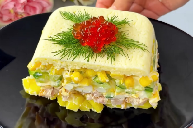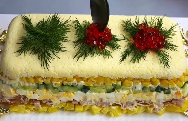 - На кукурузный слой уложите огурцы и нанесите сеточку из майонеза.