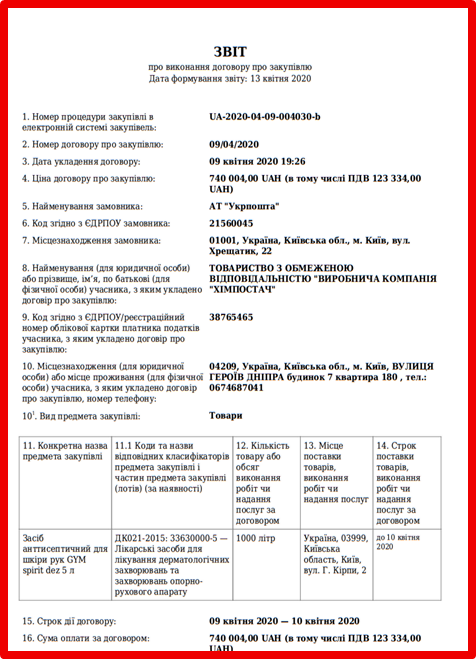 Особое внимание мы уделили одной закупке. Государственное предприятие АО УКРПОШТА приобрело у ООО «ПП ХИМПОСТАЧ» 1000 литров антисептика на общую сумму 740 000 грн. То есть 740 грн за литр мутной жидкости за космическую сумму.